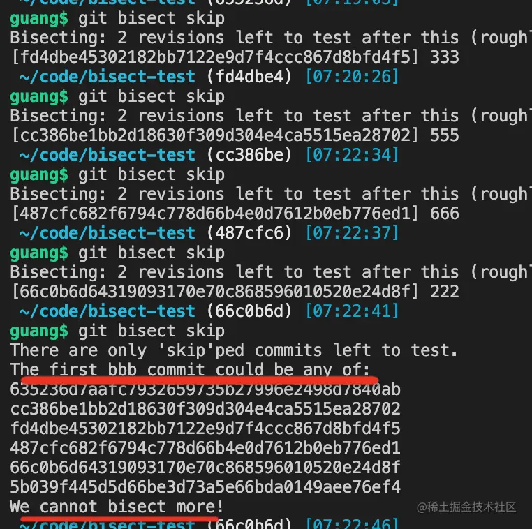 那 bisect 也没办法,它会把所有剩下的 commit 列出来,告诉你这些还没测试: