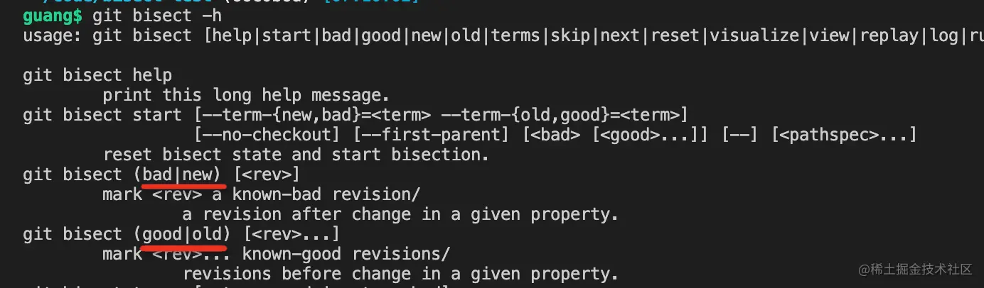 - git bisect terms:查看当前用的标记是啥