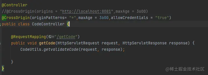 第三步, 注意跨域问题, 因为你的host进行了变更, 因此意味着你需要放行你前端的请求, 在测试时我建议直接允许所有IP跨域。如下图@CrossOrigin的配置。值得一提的是,你的springboot版本必须到达2.6.2以上,才可以使用originPatterns参数。