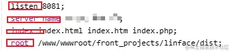 listen即前端项目运行的端口, 这是我们需要去防火墙去放行的第二个port,和当时的Mysql操作一样,直接去轻量服务器界面,宝塔界面都配置一遍即可; server_name即host,你填上公网IP或者你已经备案过的域名即可;root即dist的路径。