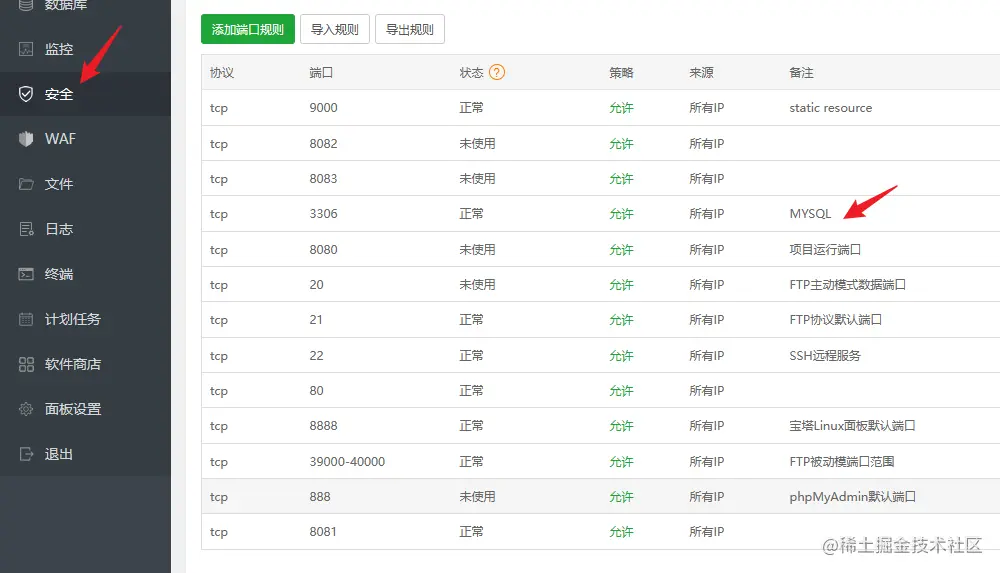这时候你要在防火墙放行你的第一个port,也就是3306端口,记得宝塔面板和轻量服务器都要放行。下图为宝塔放行界面。