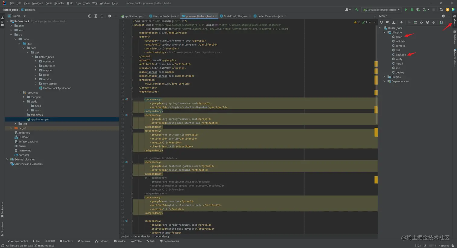 打开idea右侧的maven面板, 点击clean, 随后点击package。