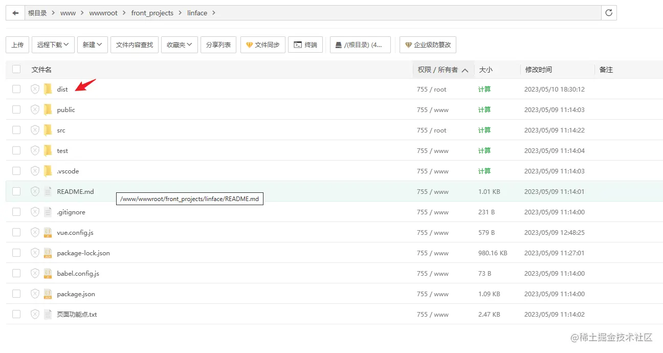 在云服务器上新建文件夹用来存放前端vue项目,在宝塔就是点击文件, 然后找个合适的地方新建文件夹。注意在拷贝的时候,把一些无关紧要的文件夹去掉,比如node_modules、测试文件, 编辑器的环境配置文件,只保留必要的文件夹。比如下图箭头标出来的文件都可以去掉,这样可以有效控制文件上传数量和大小。