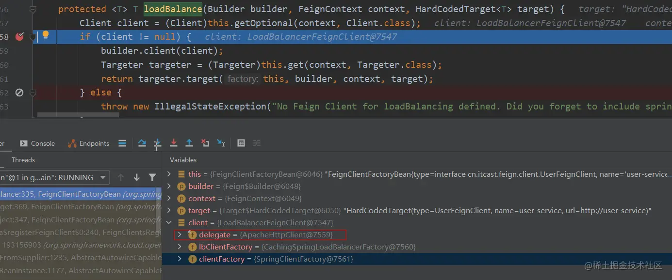 接下来,在FeignClientFactoryBean中的loadBalance方法中打断点: