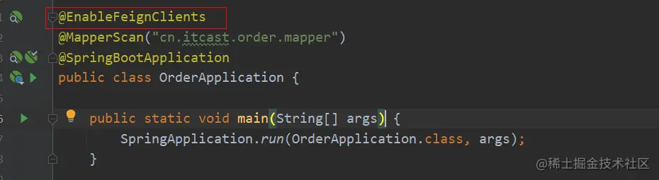 在order-service的启动类添加注解开启Feign的功能: