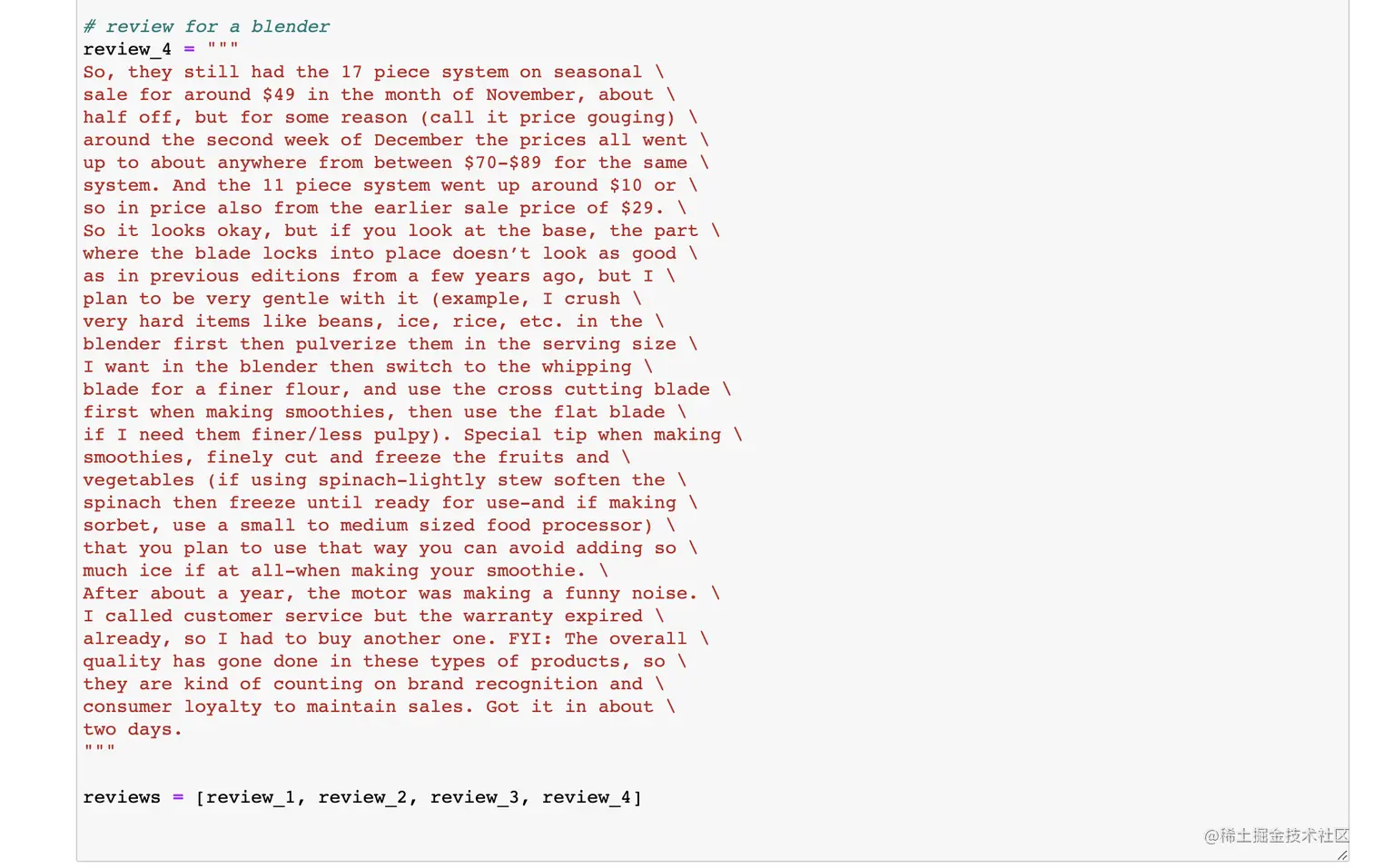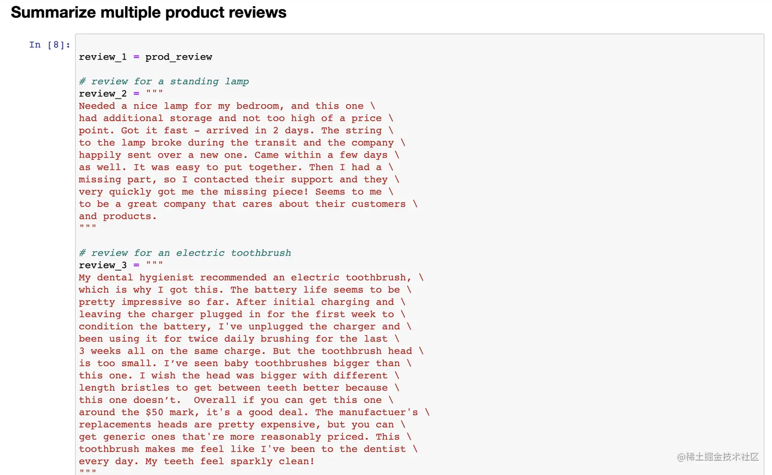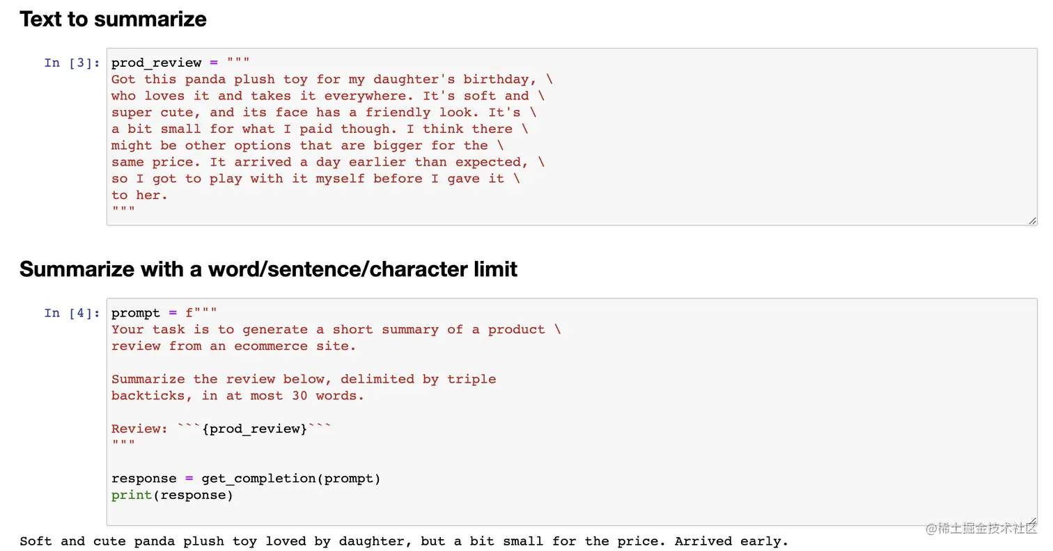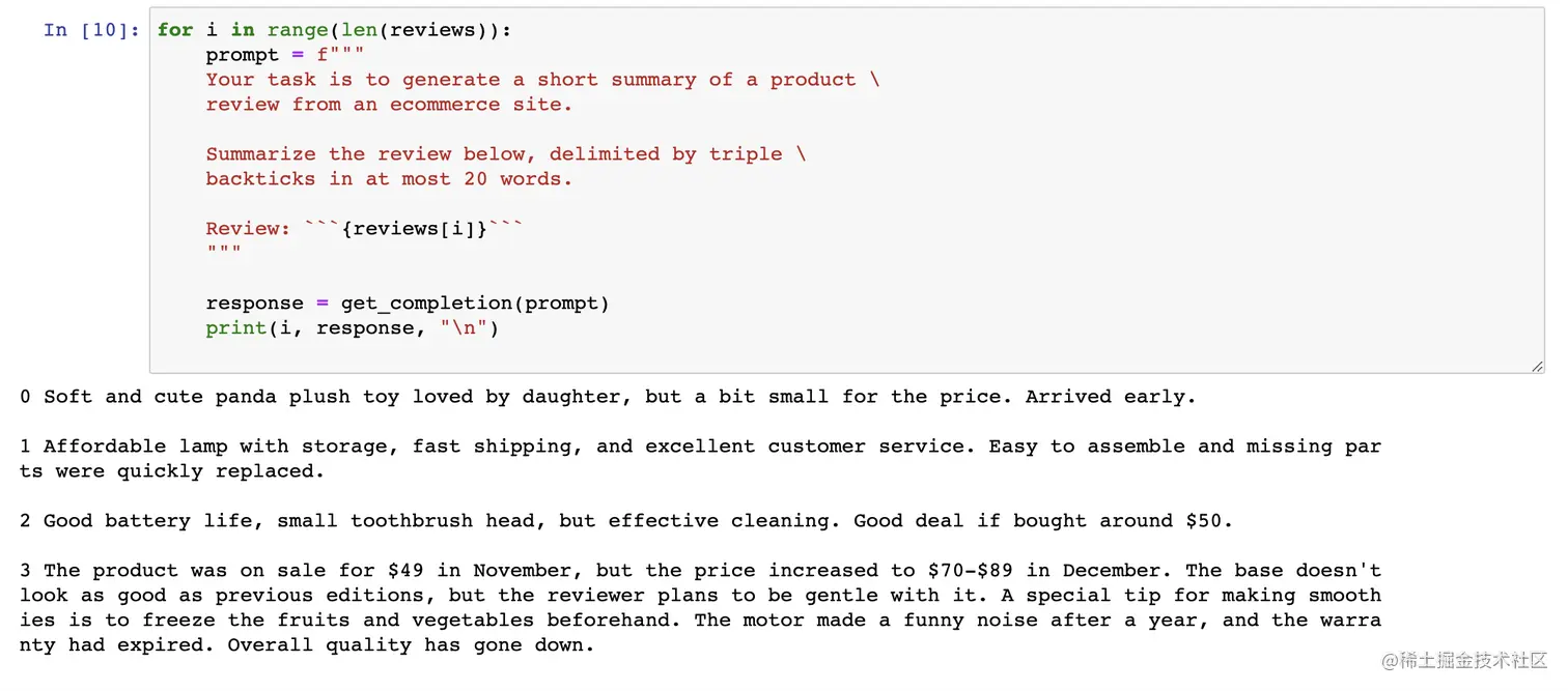 如果你正在构建一个电子商务网站并且有大量的评论,那么一个可以总结冗长评论的工具可以让你很快地浏览更多的评论,以更好地了解所有客户的想法。因此,这是一个产生摘要的提示。