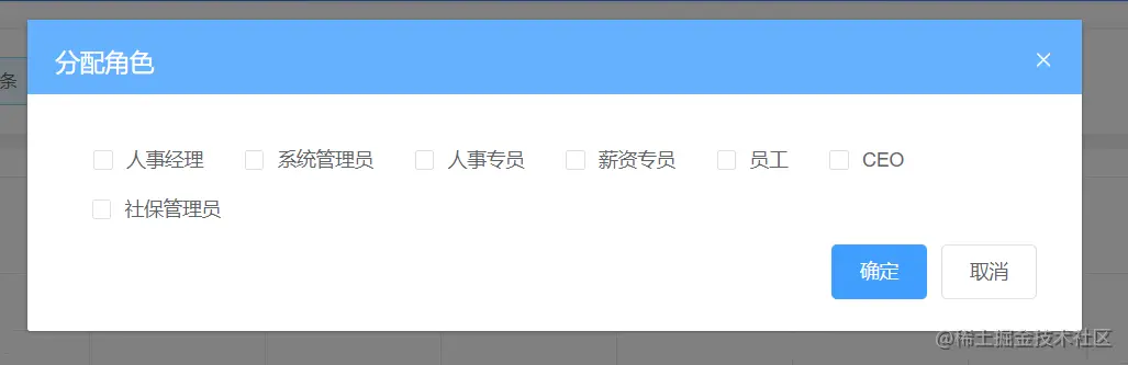 employees/components/assignRoleDialog.vue中, 铺设数据<!-- 渲染角色列表 --> <el-checkbox-group v-model="roleIdArr"> <el-checkbox v-for="obj in roleList" :key="obj.id" :label="obj.name" :value="obj.id" /> </el-checkbox-group> -