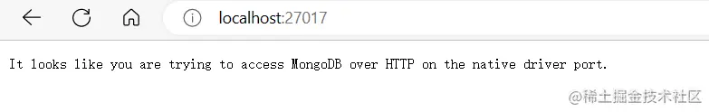 我们在浏览器中测试一下输入localhost:27017,看到 It looks like you are trying to access MongoDB over HTTP on the native driver port. 就能证明 MongoDB 启动成功
