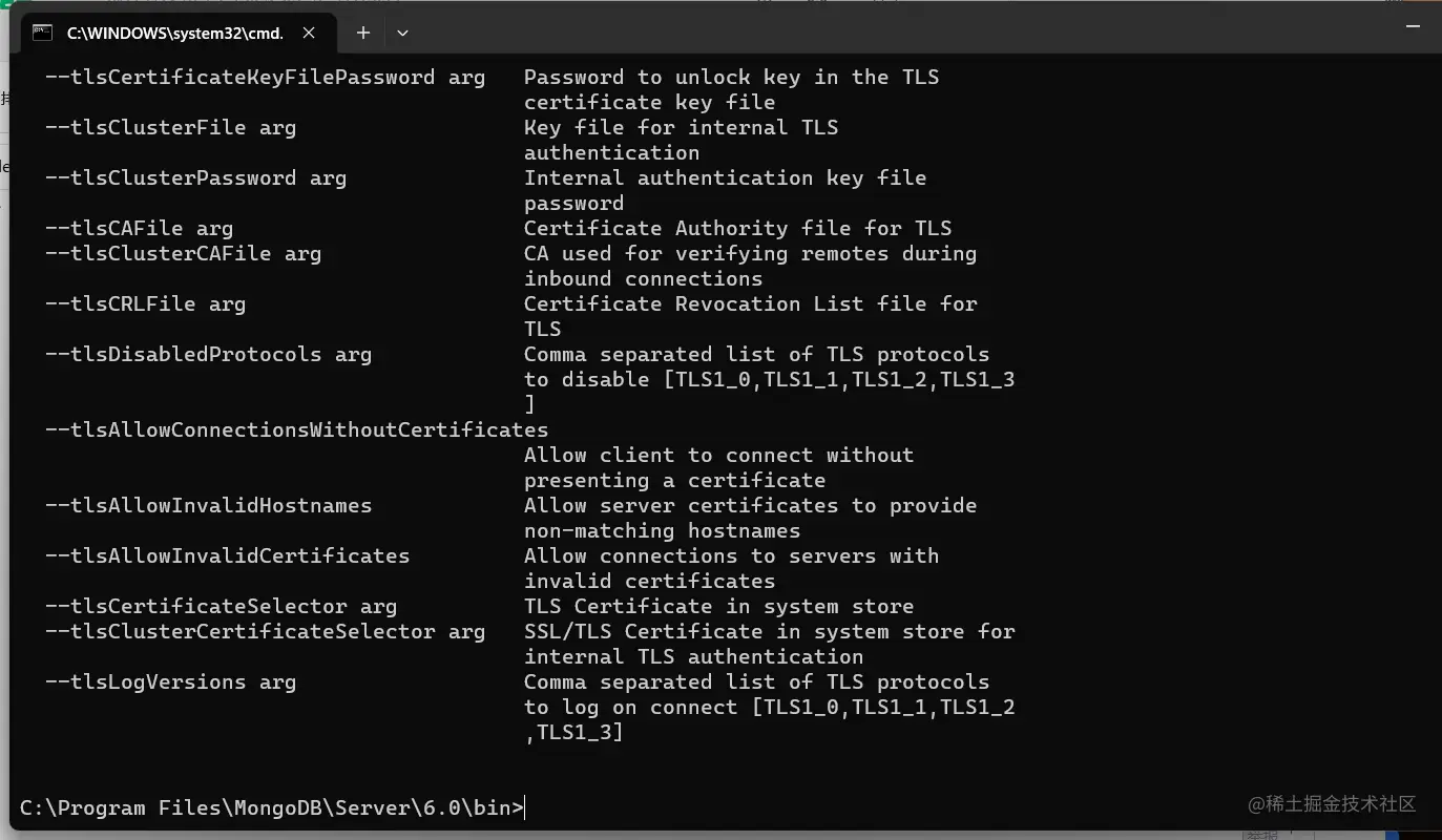 执行mongod -dbpath C:\Program Files\MongoDB\Server\6.0\data\db (后面的路径是读者的安装路径)命令如下图