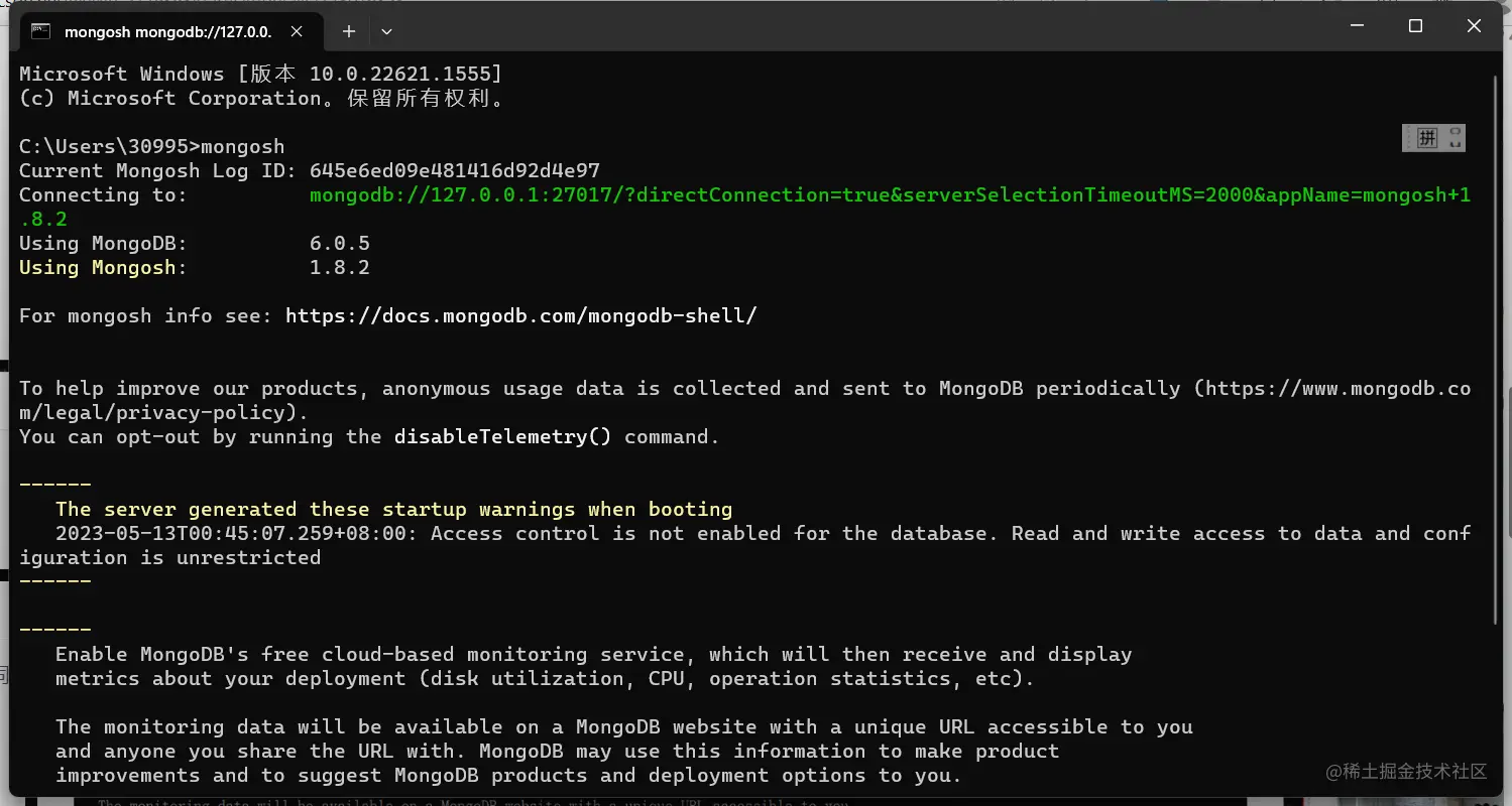 打开cmd,输入mongosh,即可进入到mongodb,如下图表示安装完成