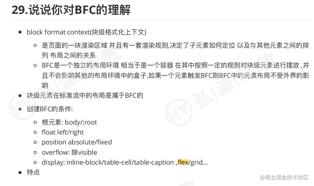 6.BFC:就是一个独立的容器,按照一定的规则对容器里面的子元素进行摆放,且不会影响外边的元素。