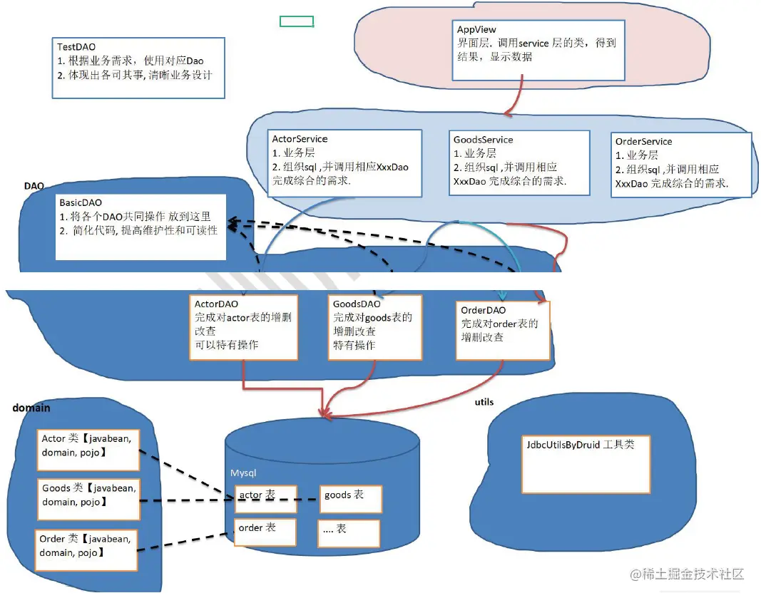 - 引出=》 BasicDAO画出示意图,看看在实际开发中,应该如何处理