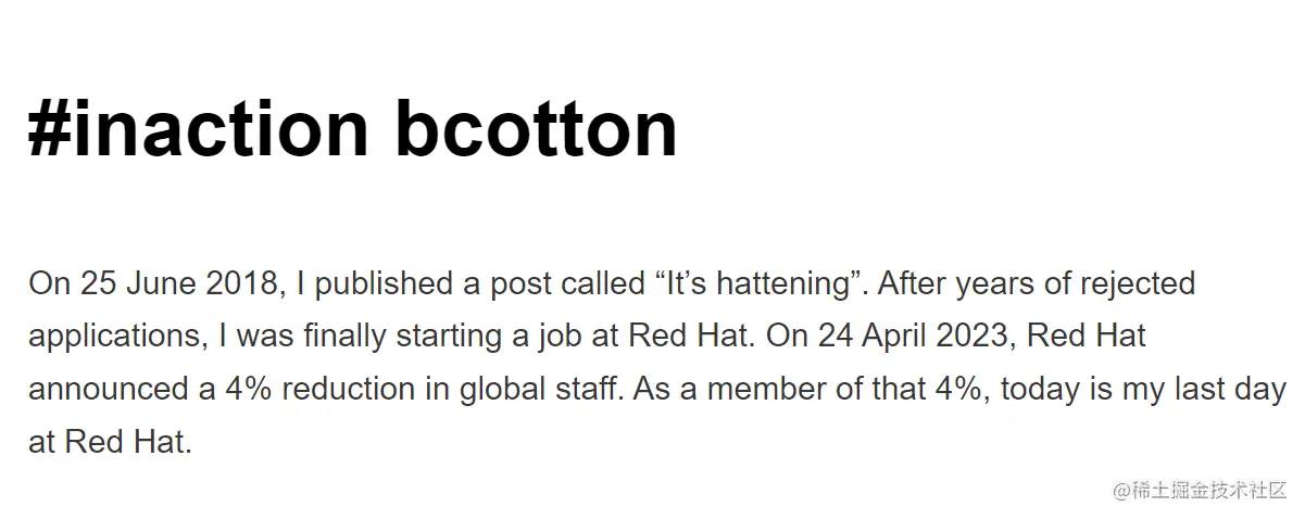 据媒体 Phoronix 报道,作为 Red Hat 公司近期裁员 4% 计划的一部分,Fedora 项目经理 Ben Cotton 也在这轮 “降本增效” 浪潮中被解雇。