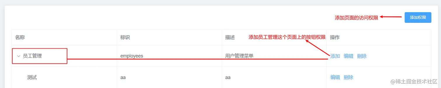 - 点击的时候, 传递要删除的权限点的id, 调用接口, 重新请求列表即可