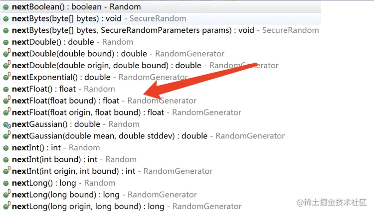 SecureRandom 给我们提供了 nextBoolean()、nextBytes()、nextDouble()、nextFloat()、nextInt() 等随机数生成方法,如下图所示: