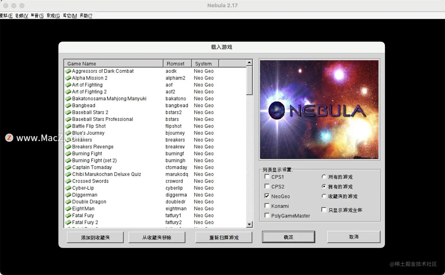 Nebula街机模拟器 Mac移植 汉化版 用户2355370652866 2023-05-15 481 阅读1分钟 nebula星云模拟器是电脑上最热门的街机游戏模拟器之一,玩家可以通过这个小巧的模拟器软件进行多款经典街机游戏启动和畅玩,本次移植的包含400多款游戏roms,经典的三国志、三国战纪、拳皇、街霸、合金弹头、1941都包含在内。 下载:Nebula街机模拟器 Mac移植 汉化版