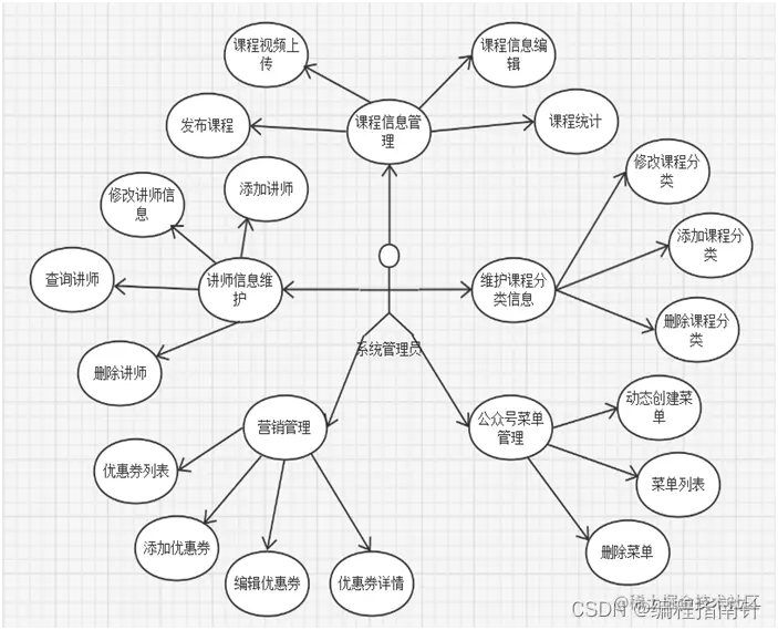 管理员通过账号密码登录后台管理系统后,可以对讲师、课程、公众号菜单等进行管理。根据分析显示,后台管理员角色需要实现的功能有:登录,讲师管理,课程分类管理,点播课程管理,公众号菜单管理,营销管理等。系统管理员的用例图如图3-2所示: