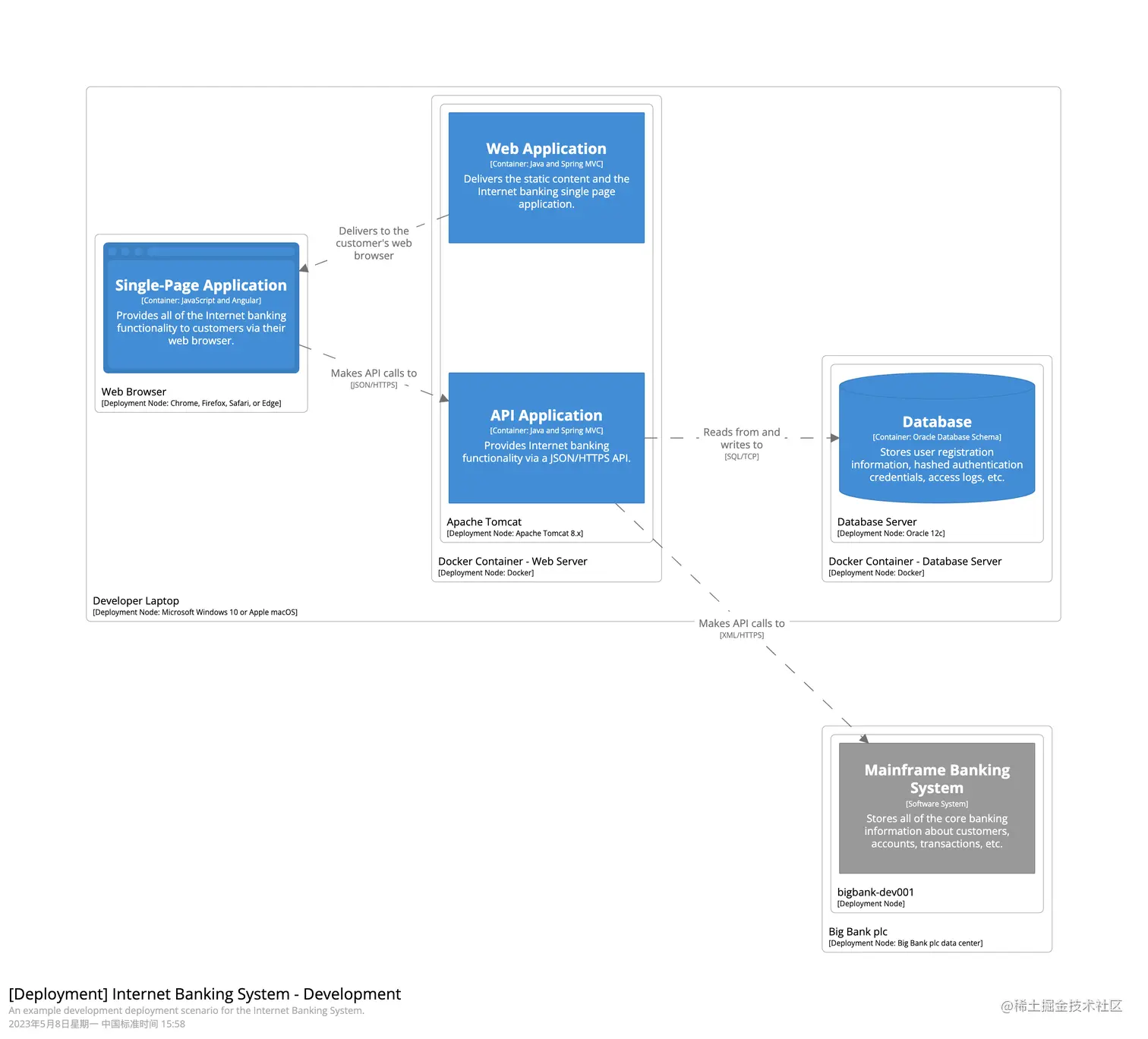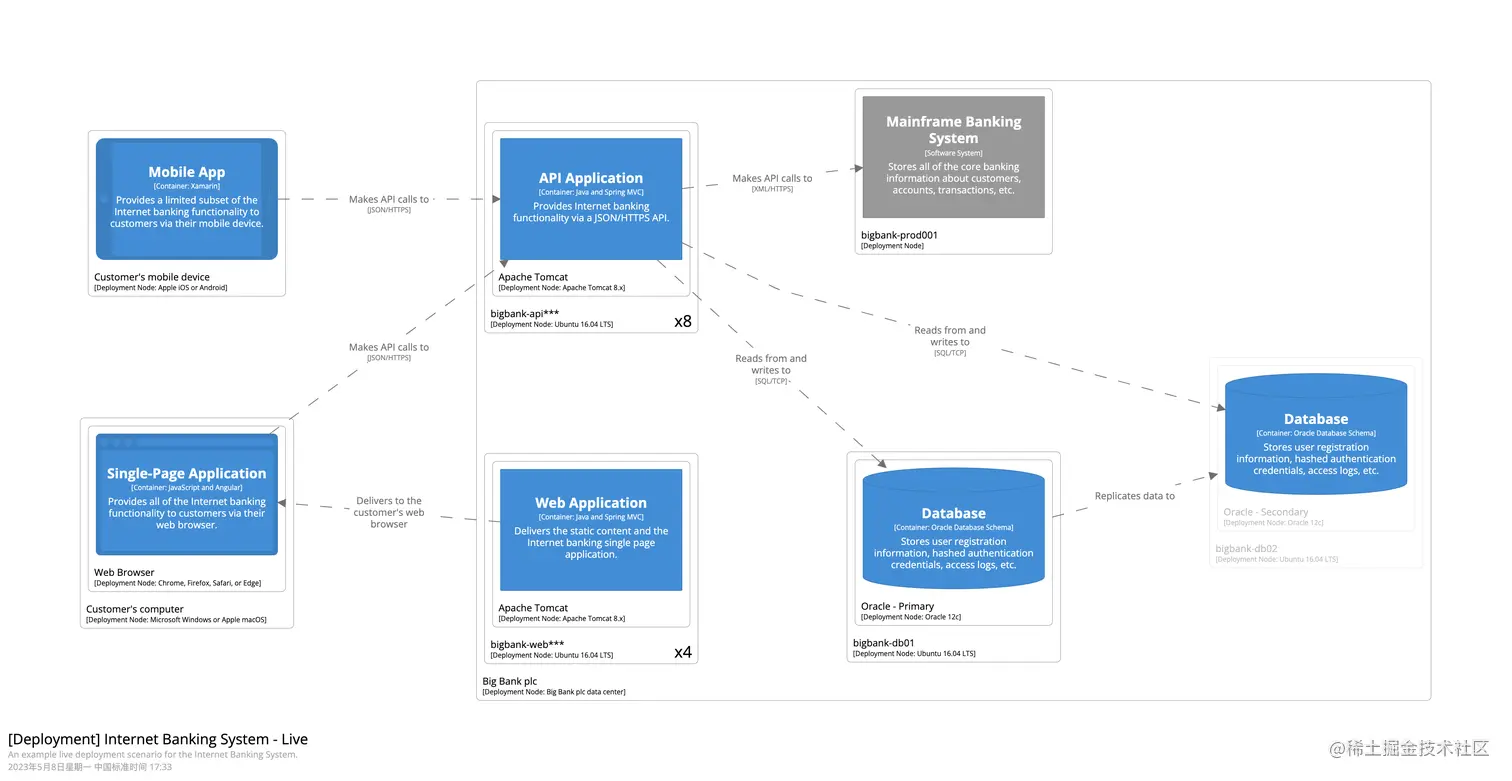 C4的部署图基于UML 部署图,但为了突出显示容器和部署节点之间的映射会做略微的简化。