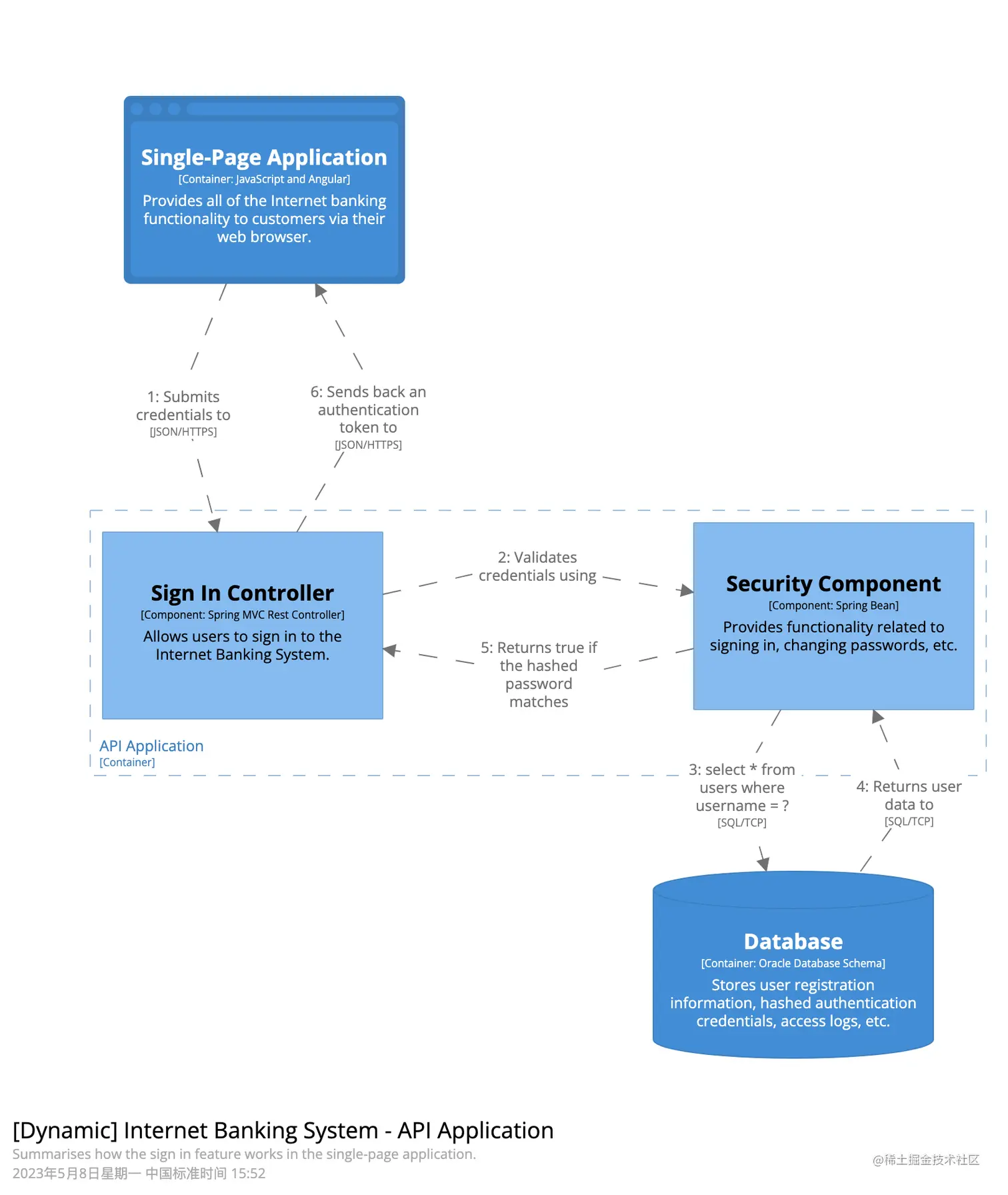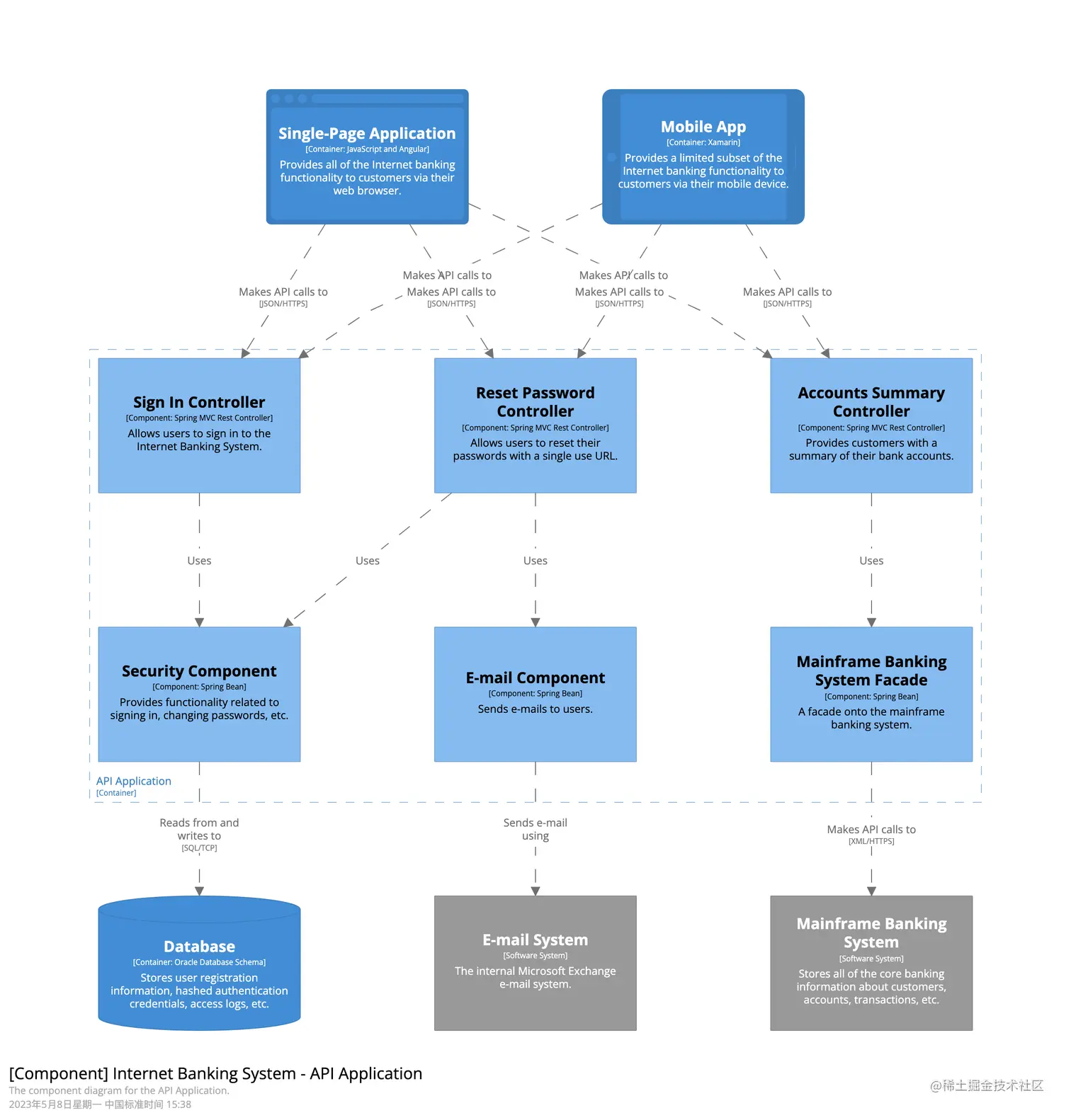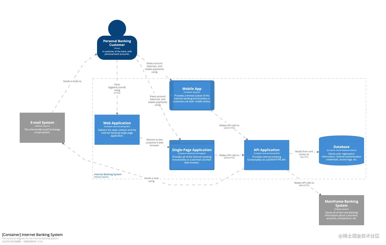 网上银行系统(此时System Contenxt中的系统已经被展开,所以用虚线框表示)由五个容器组成:服务器端 Web 应用程序、单页应用程序、移动应用程序、服务器端 API 应用程序和数据库。