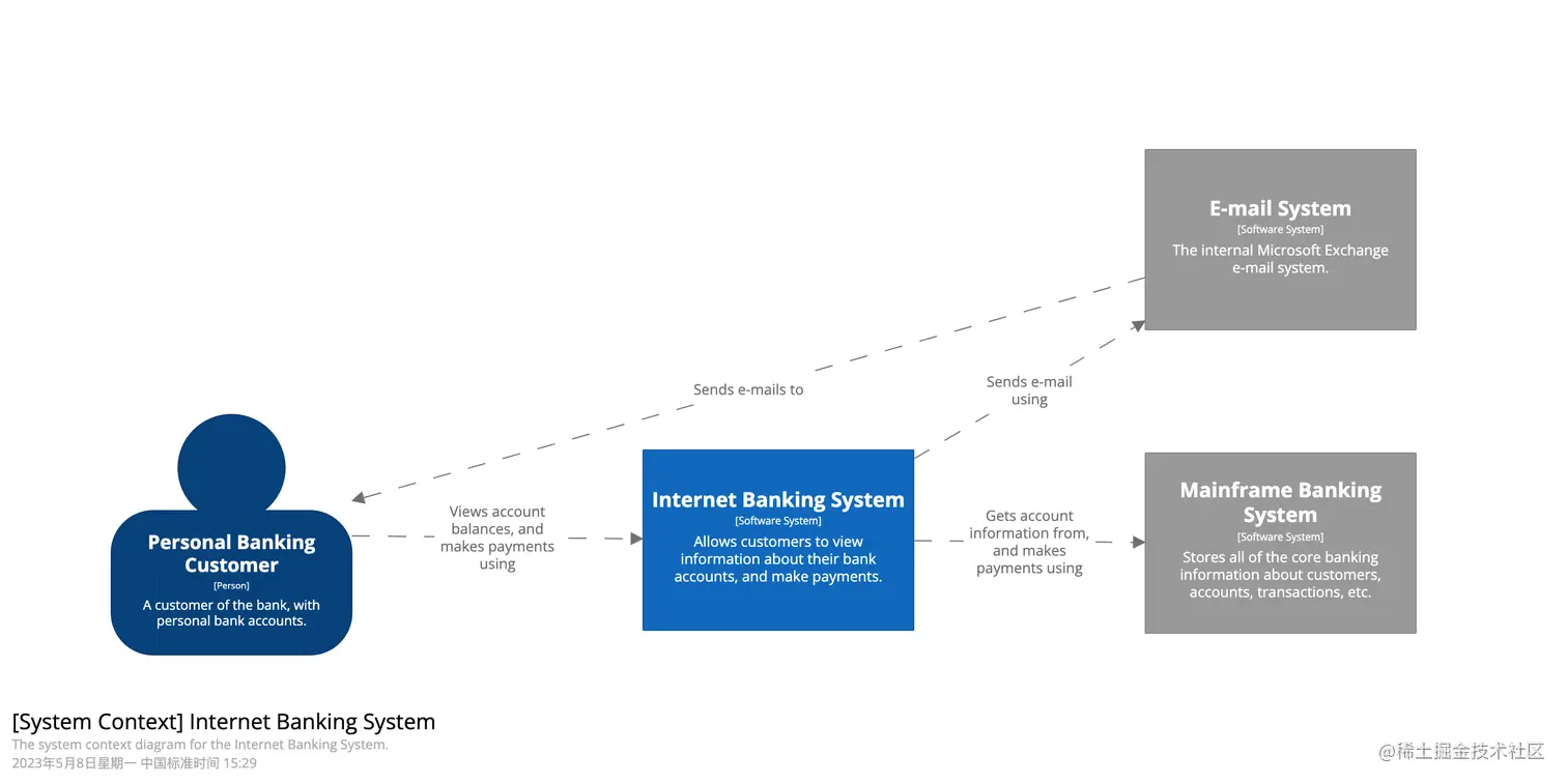 这是该网上银行系统的系统上下文图。它显示了使用它的人,以及与该系统有关系的其他软件系统。网上银行系统是将要建设的系统,银行的个人客户使用网上银行系统查看其银行账户的信息并进行支付。网上银行系统本身使用银行现有的大型机银行系统来执行此操作,并使用银行现有的电子邮件系统向客户发送电子邮件。