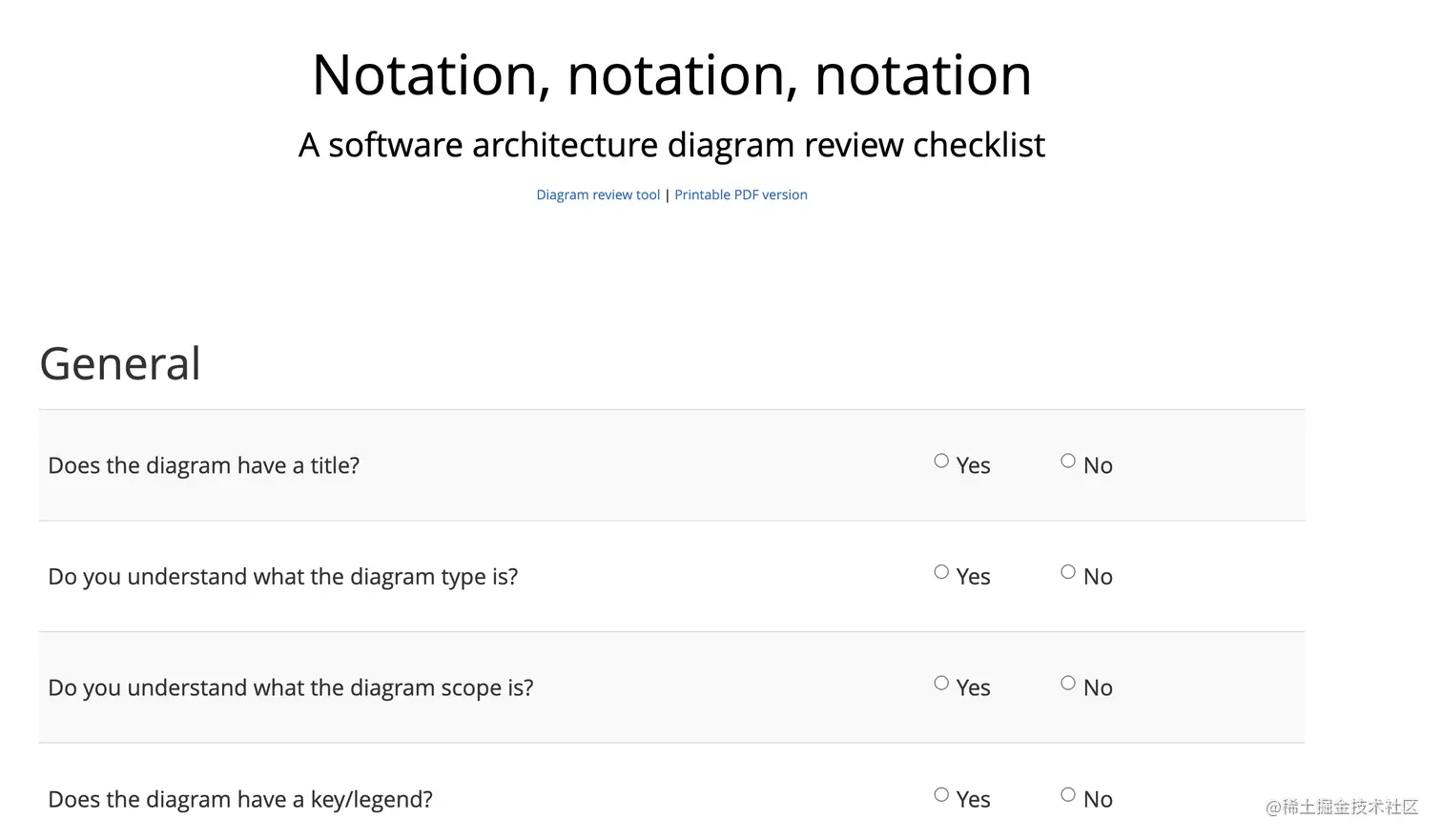 C4模型图表绘制完成后,可以通过Review Checklist 进行自查,检查是否有不规范之处。Review Checklist被制成网页,可以通过 c4model.com/review/ 进行访问。