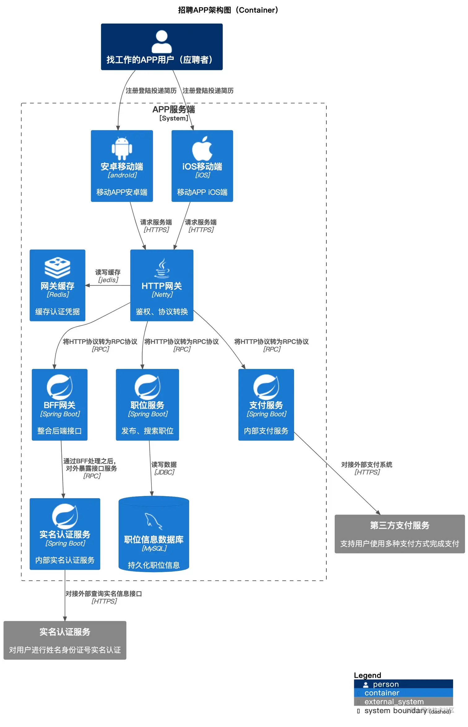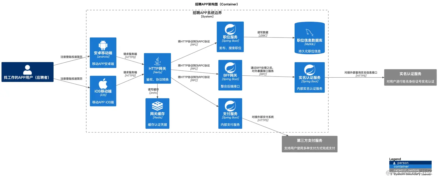 以某招聘APP服务端架构图(Container级)为例子进行讲解,以下是渲染出来的效果图。