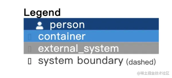 System_Boundary:某系统展开为容器时,则将System改为System_Boundary,代表系统的边界,内部放置容器元素,通常渲染为虚线框。
