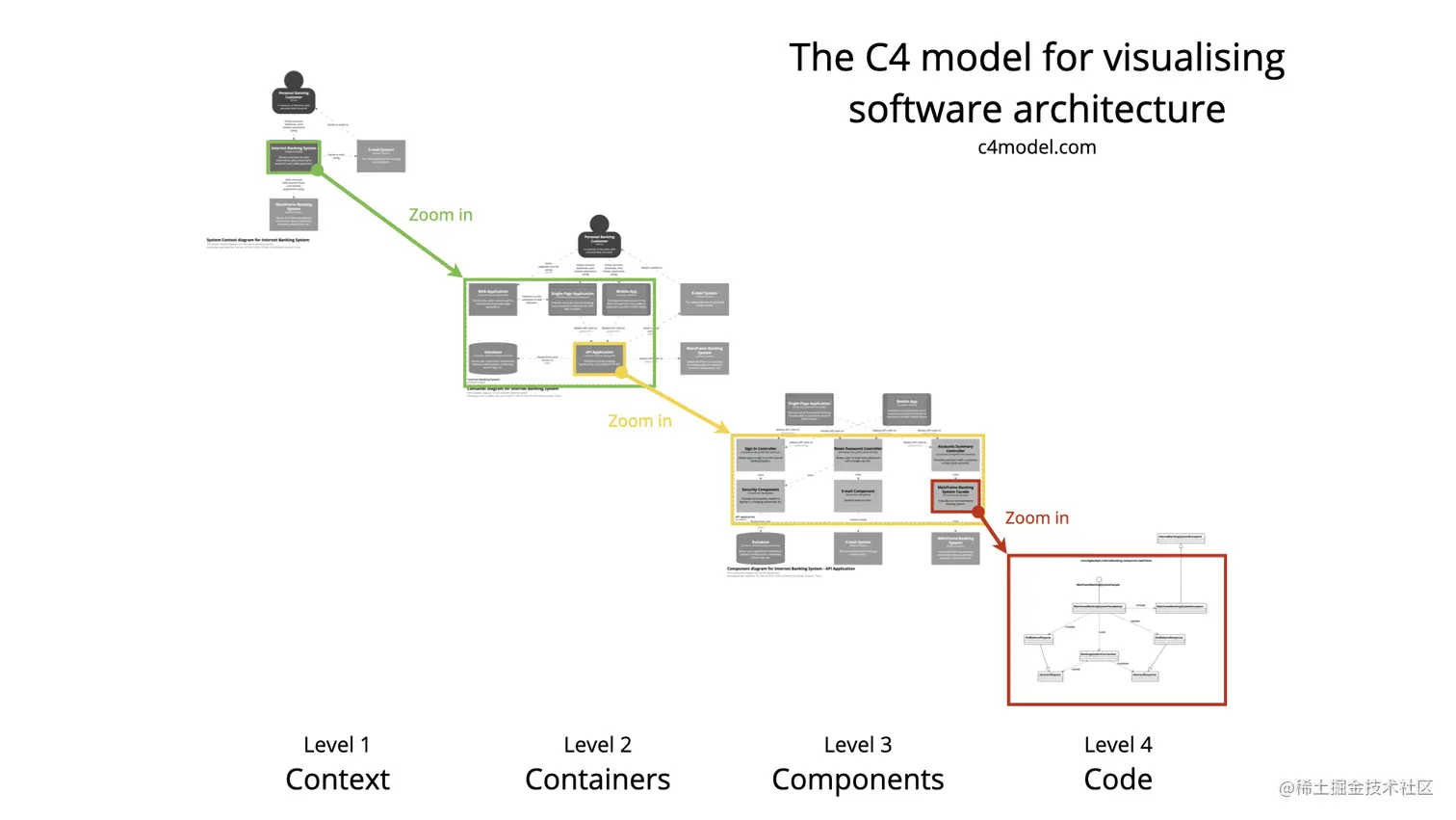 C4模型将系统从上往下分为System Context, Containers, Components, Code四层视图,每一层都是对上一层的完善和展开,层层递进地对系统进行描述,如下图。