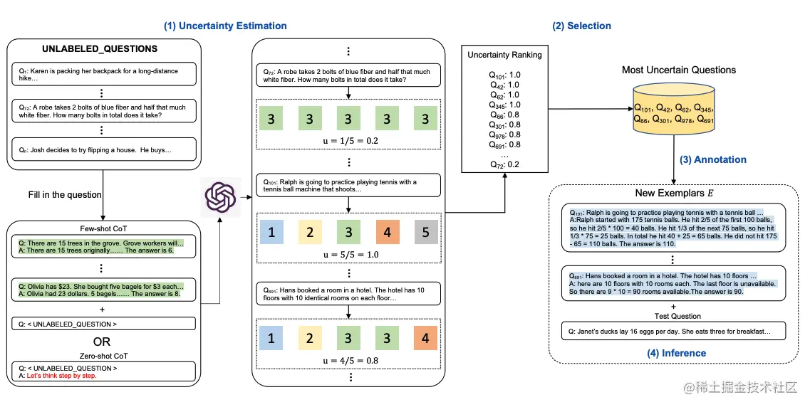 以下是该方法的示意图。第一步是查询 LLM,可以带有或不带有几个 CoT 示例。针对一组训练问题生成 k 个可能的答案。基于 k 个答案计算不确定性指标(使用不同意)。选择最不确定的问题供人类进行注释。然后使用新注释的示例推断每个问题。