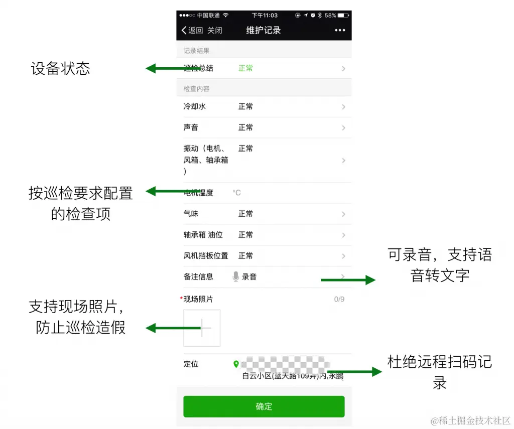 巡检人员在进行设备巡检时,需提交现场照片进行佐证,通过限制地理位置、只允许现场拍摄,不允许从相册上传以及所拍摄的照片自带时间水印等方式可以确保巡检人员没有缺位,所上传的巡检数据是真实可靠的。