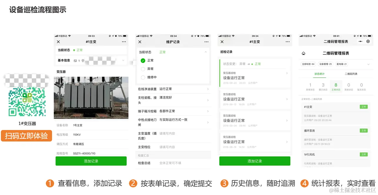 巡检人员通过手机微信扫码即可直接查看设备信息和历史巡检记录,点添加记录可添加巡检内容,里面的巡检选项根据公司的巡检要求进行配置,不同的设备有不同的巡检要求。