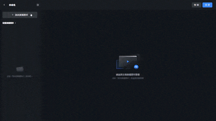 3.在编辑页中,用户可自由添加演播素材并拖拽演播素材调整顺序,编辑完成后可点击投屏按钮开始投屏,输入演播码连接远程操控