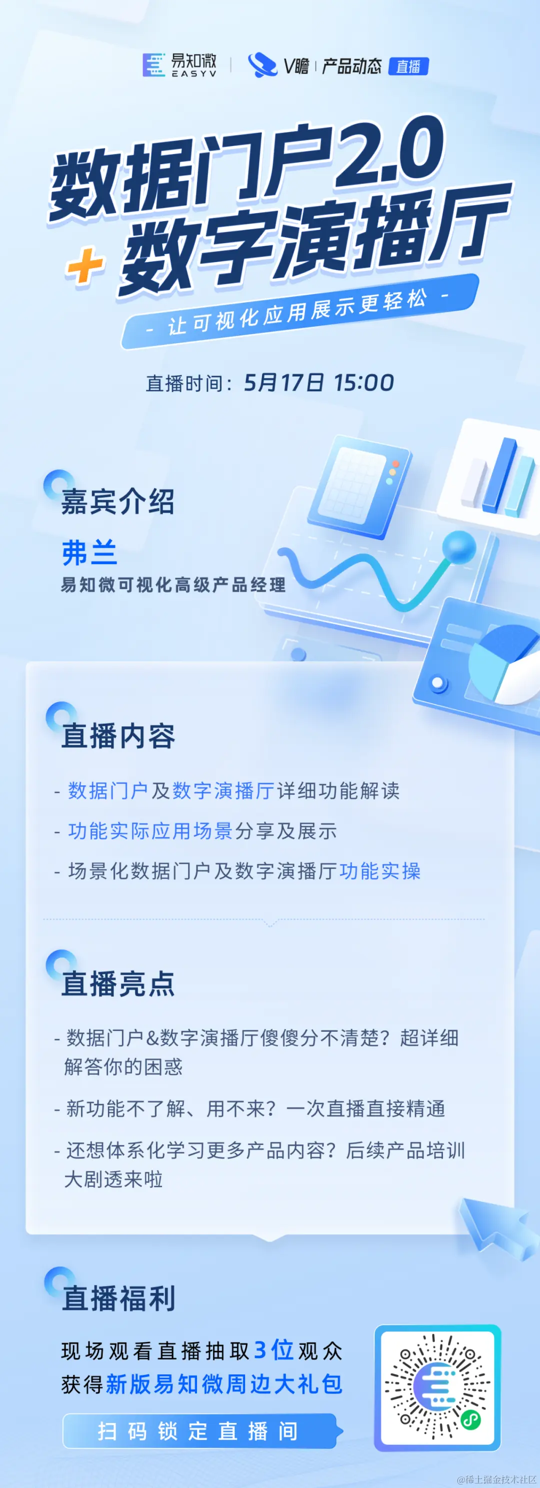 在数字演播厅上线的同时,原有的数据门户也进行焕新升级,为了帮助大家更好的使用**「数据门户」及「数字演播厅」,我们将会在5月17日(下周三)下午3点**和大家分享数据门户与数字演播厅的功能解读,并结合功能实际应用场景进行实操演示。