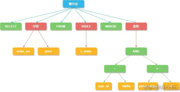 SQL解析过程分为词法解析和语法解析两步,比如下边查询用户订单的SQL,先用词法解析将这条SQL拆解成不可再分的原子单元。在根据不同数据库方言所提供的字典,将这些单元归类为关键字,表达式,变量或者操作符等类型。