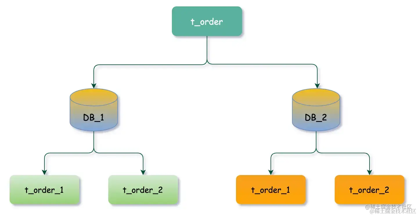 数据节点是数据分片中一个不可再分的最小单元(表),它由数据源名称和数据表组成,例如上图中 DB_1.t_order_1、DB_2.t_order_2 就表示一个数据节点。