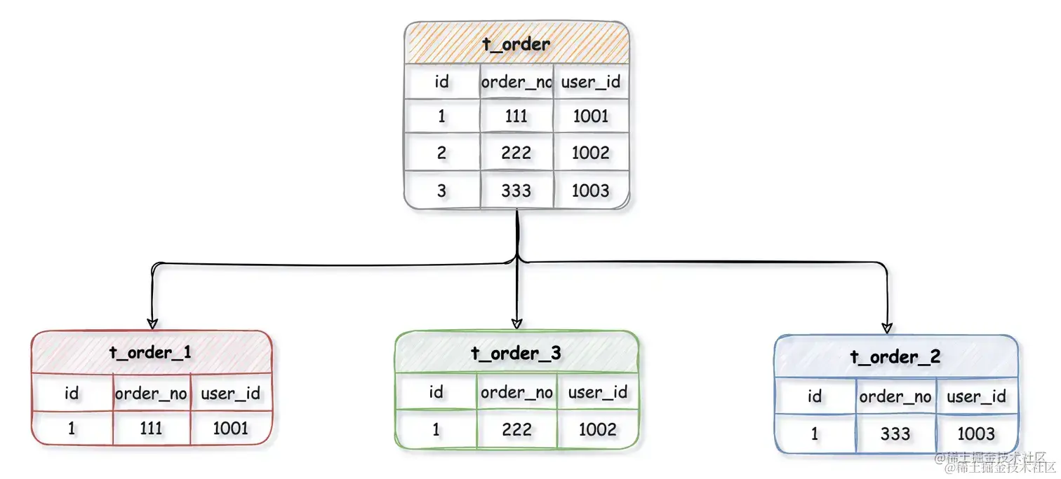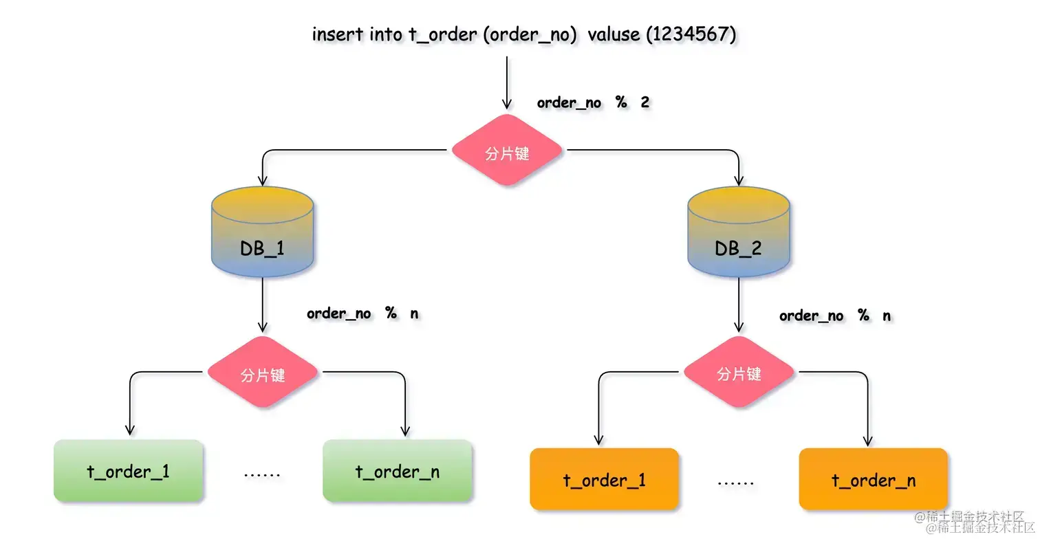 在这个过程中,order_no 就是 t_order 表的分片键。也就是说,每一条订单数据的 order_no 值决定了它应该存放的数据库实例和表。选择一个适合作为分片键的字段可以更好地利用水平分片带来的性能提升。