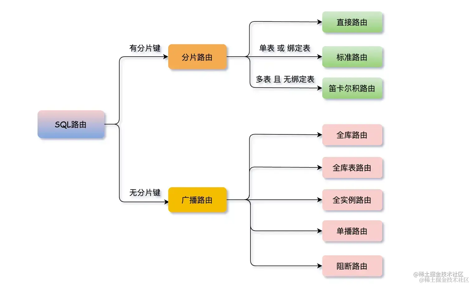 有分⽚键的路由叫分片路由,细分为直接路由、标准路由和笛卡尔积路由这3种类型。