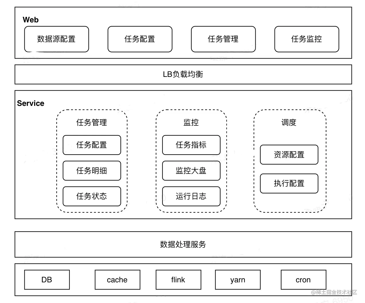 - Web层: 提供管理控制台,用户可以方便地配置和管理数据集成任务,查看任务的执行状态;