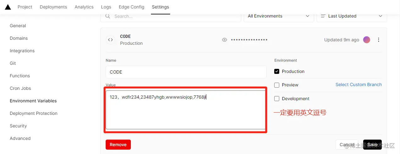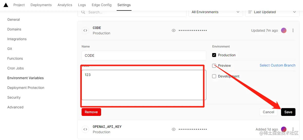 - 进入Vercel控制台,找到你的项目,并点击进入环境变量编辑界面。