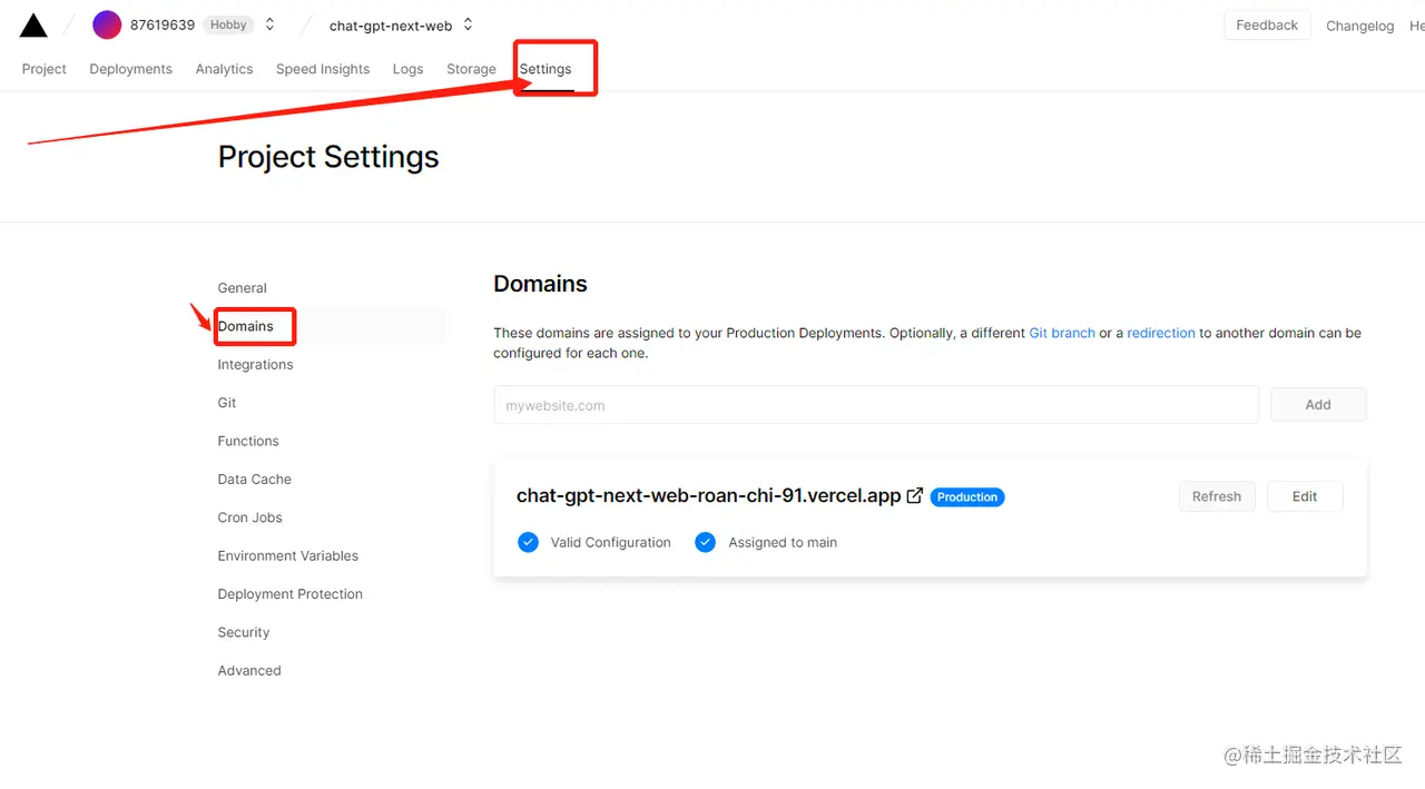 - 进入你在Vercel控制台创建的项目:点击Settings-Domains。配置你的域名。