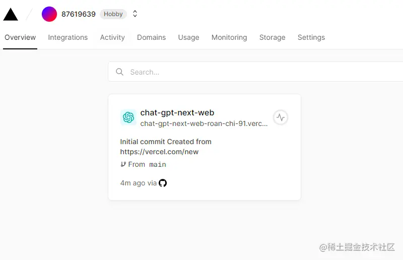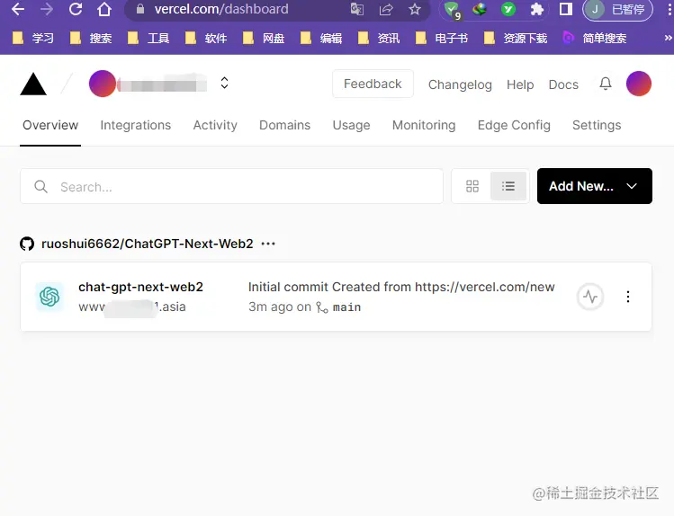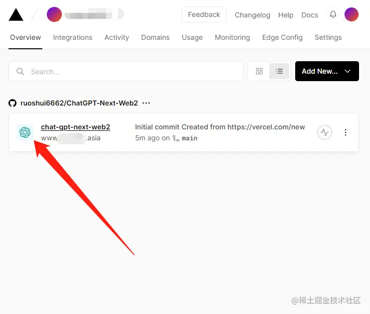 - 保存设置后,返回Vercel控制台。页面会自动刷新,刷新完毕后,点击左上角的超链接图标,你就可以通过域名访问你刚刚搭建的网站了。