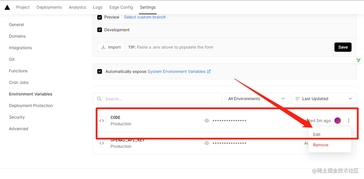 - 访问Vercel并登录自己的账户:进入项目后,打开Setting-Environment Variables,你可以看到自己的API-KEY。