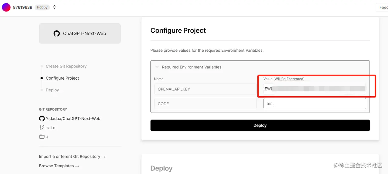 - 一键部署程序:点击"Deploy",然后输入自己的名字,创建自己的项目。