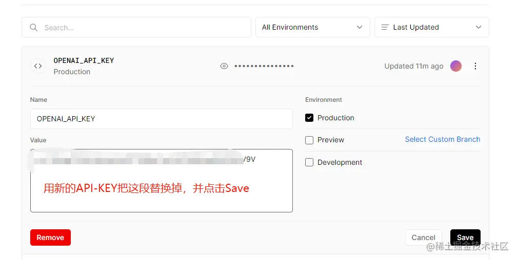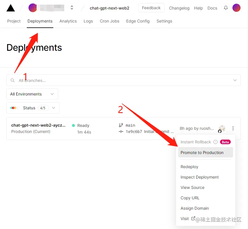 - 和更换API一样,完成操作后需要进入Deployments 点击最新的一个部署,选择"Promote to Production",这样才能使最新的环境变量生效。