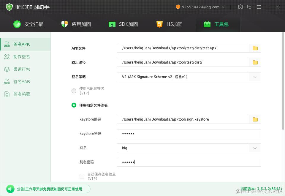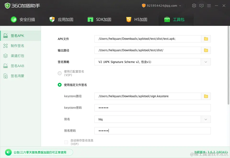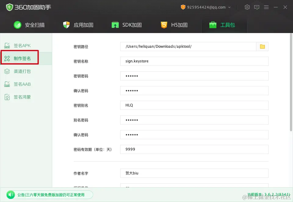 随后我们借助 360 加固工具,快速创建一个 keystore 证书: