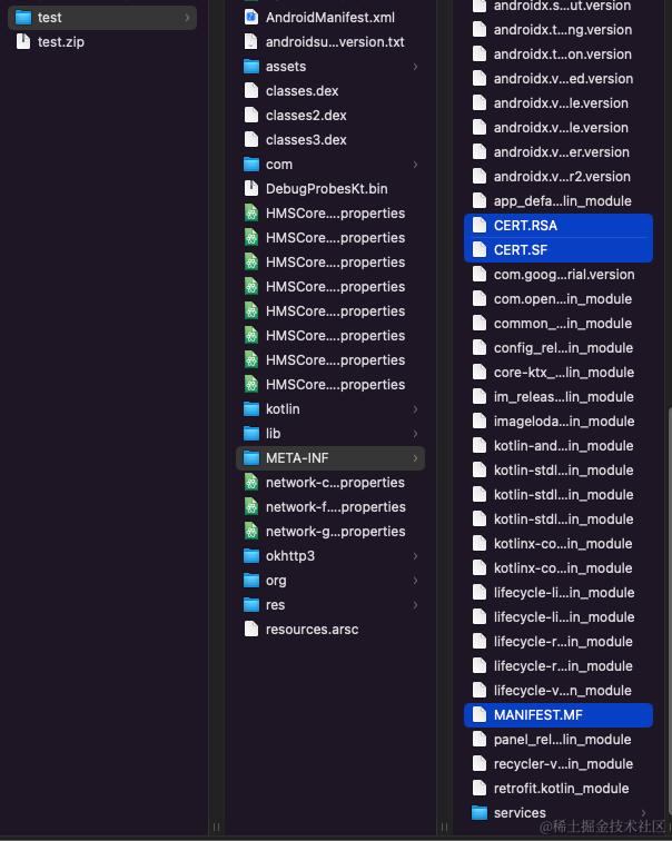 那么我们同样也可以通过将 .apk 修改为 .zip,并解压,这里一起来看下解压后的目录,这里我们着重关注 META-Info 目录。