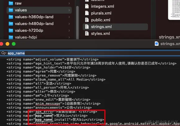 res/string 文件中直接搜索 app_name,并修改为指定名称: