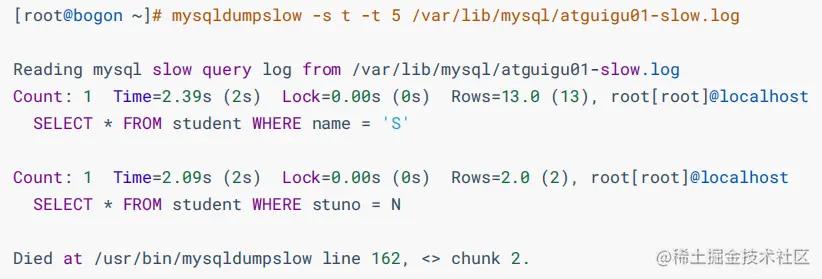 mysqldumpslow -s t -t 5 /var/lib/mysql/atguigu01-slow.log