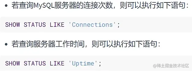 在MySQL中,可以使用 SHOW STATUS 语句查询一些MySQL数据库服务器的 性能参数 、 执行频率 。