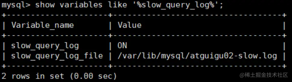 你能看到这时慢查询分析已经开启,同时文件保存在 /var/lib/mysql/atguigu02-slow.log 文件